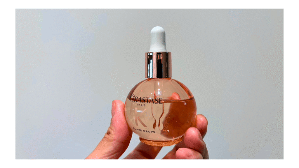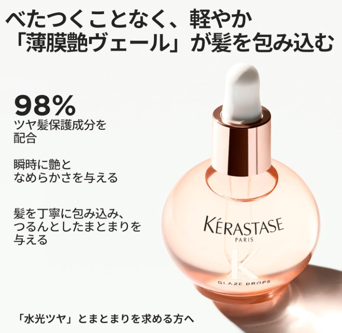 しかし今回、ケラスターゼから発売された「グロスアブソリュ グレイズドロップスヘアオイル」に出会い、その常識が変わりました。ジュエリーのように煌めくボトル、みずみずしく「ぷるん」と弾むテクスチャー、そして何より「水光」と表現したくなるような、内側から輝く艶。