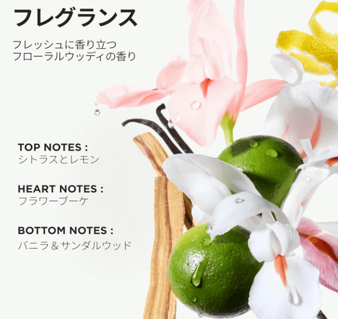 いわゆる「さらさらオイル」と「とろみオイル」の良いとこ取りのような不思議な感触です。香りはフローラルウッディーと記載がありますが、まず最初にふわっと広がるのは、フレッシュなピオニーやスズランのような透明感のある花香。その後、ウッディベースのサンダルウッドやシダーがほのかに香り、甘くなりすぎない大人の印象です。