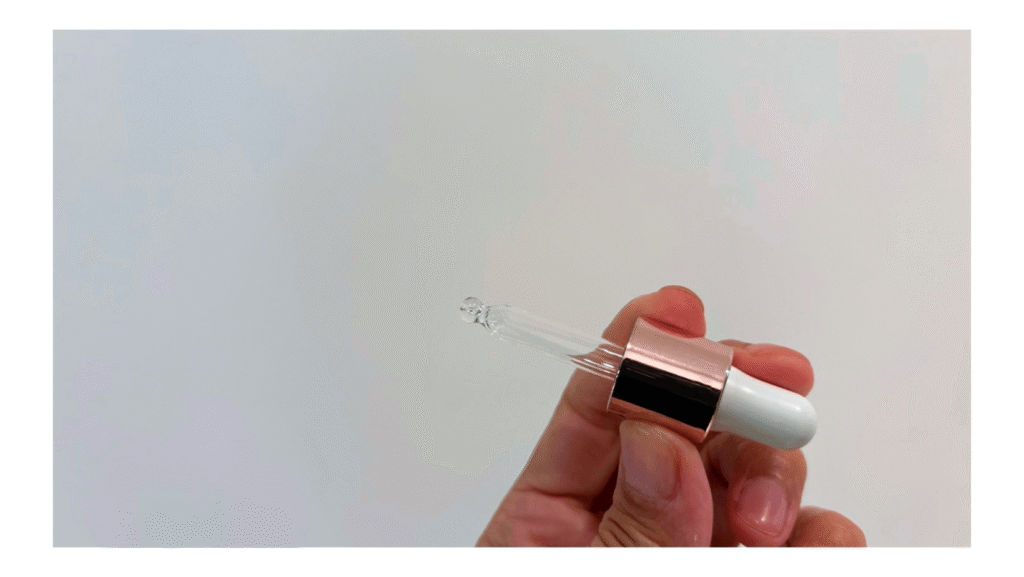さっそくピペットを回して開け、オイルを吸い上げてみます。色はほぼ透明に近い、ほんのり黄金がかったクリアな液体。テクスチャーは水のようにさらさらで、垂れそうになるくらいサラサラです。しかし指で伸ばしてみると、じんわりとコクを感じる。